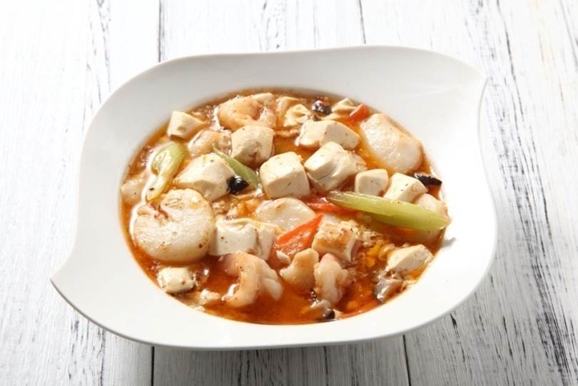再加料灑、上湯、豆腐、蝦球、草菇、胡蘿卜片、草菇、帶子調(diào)好味;